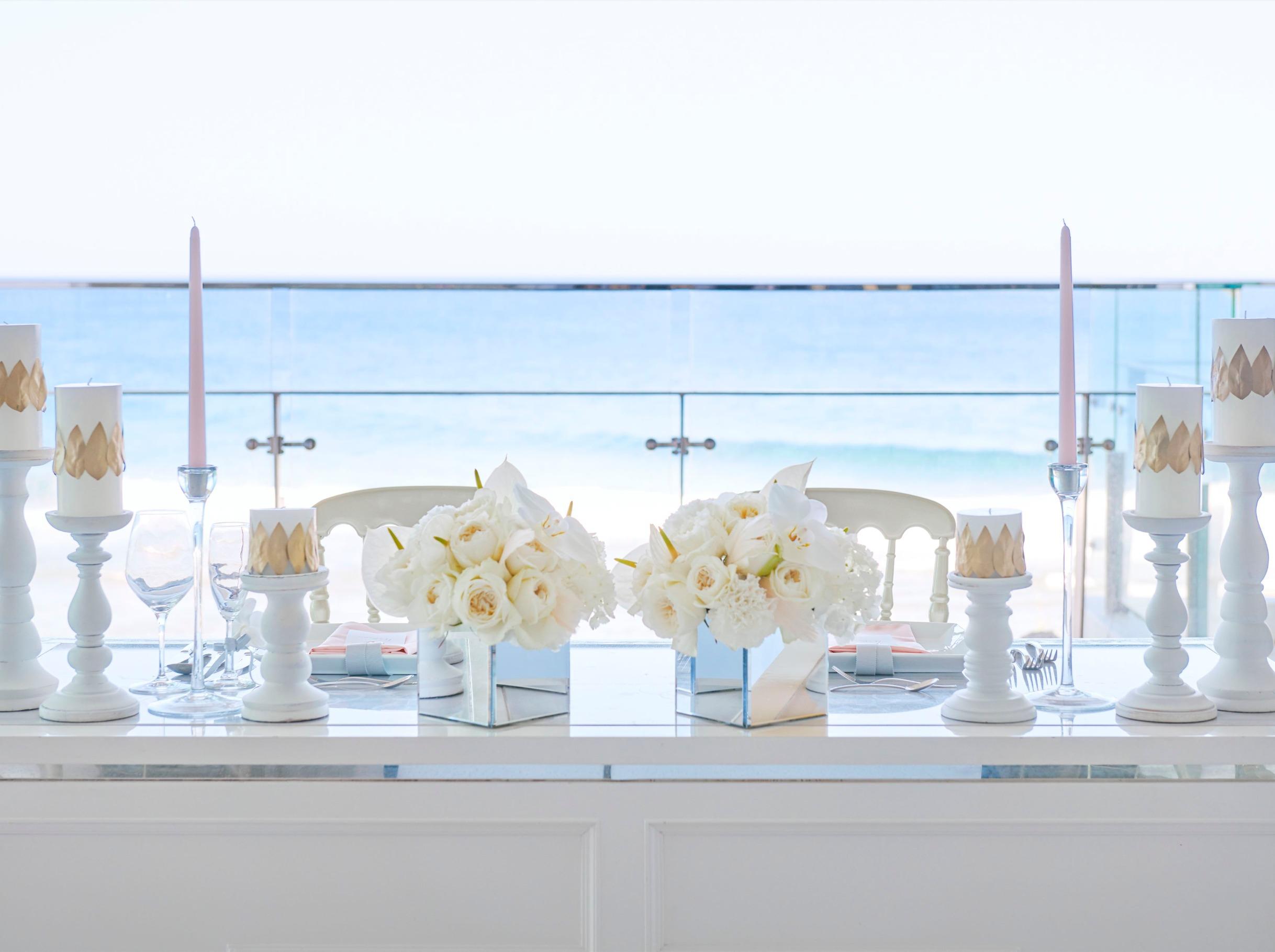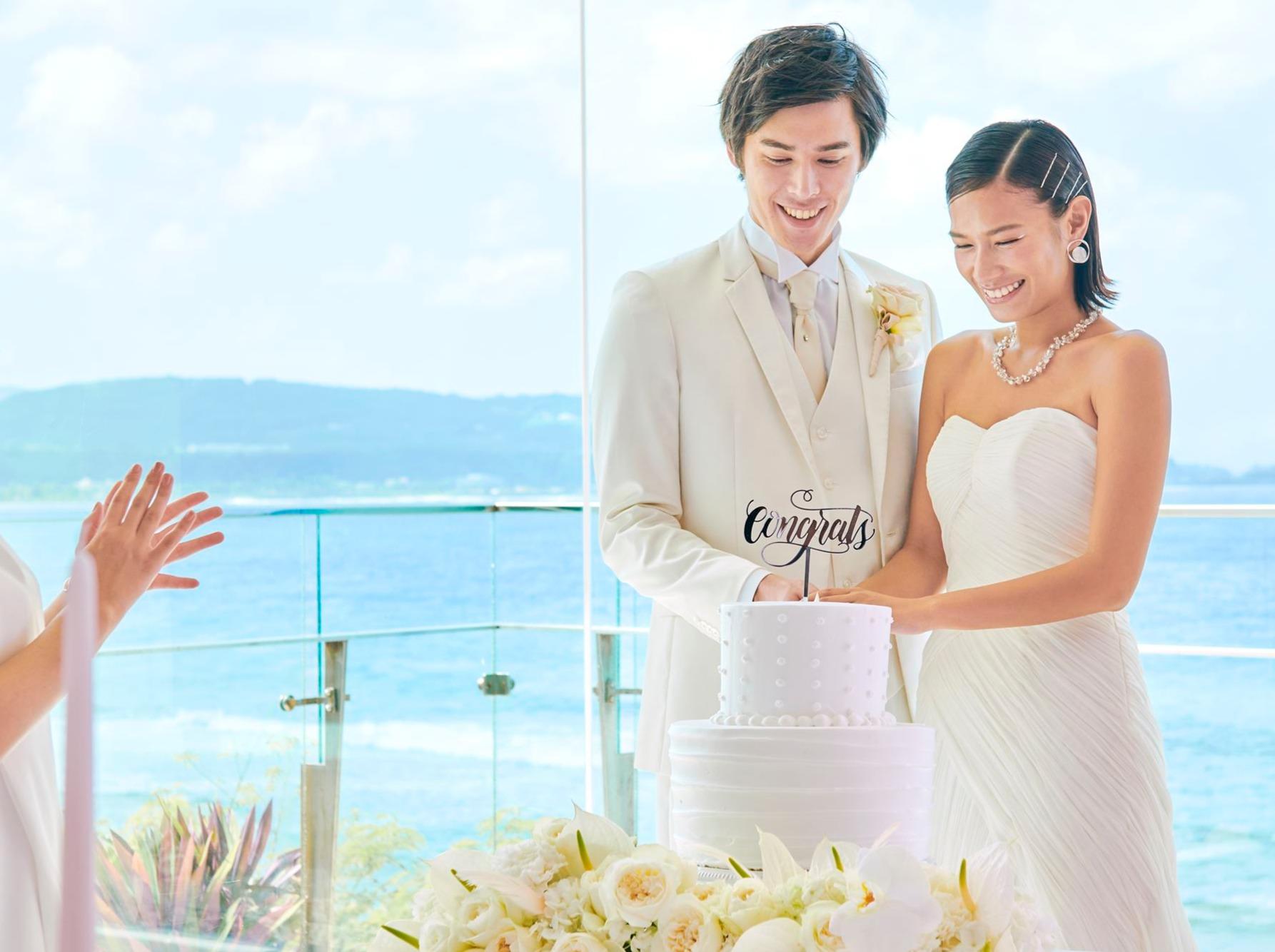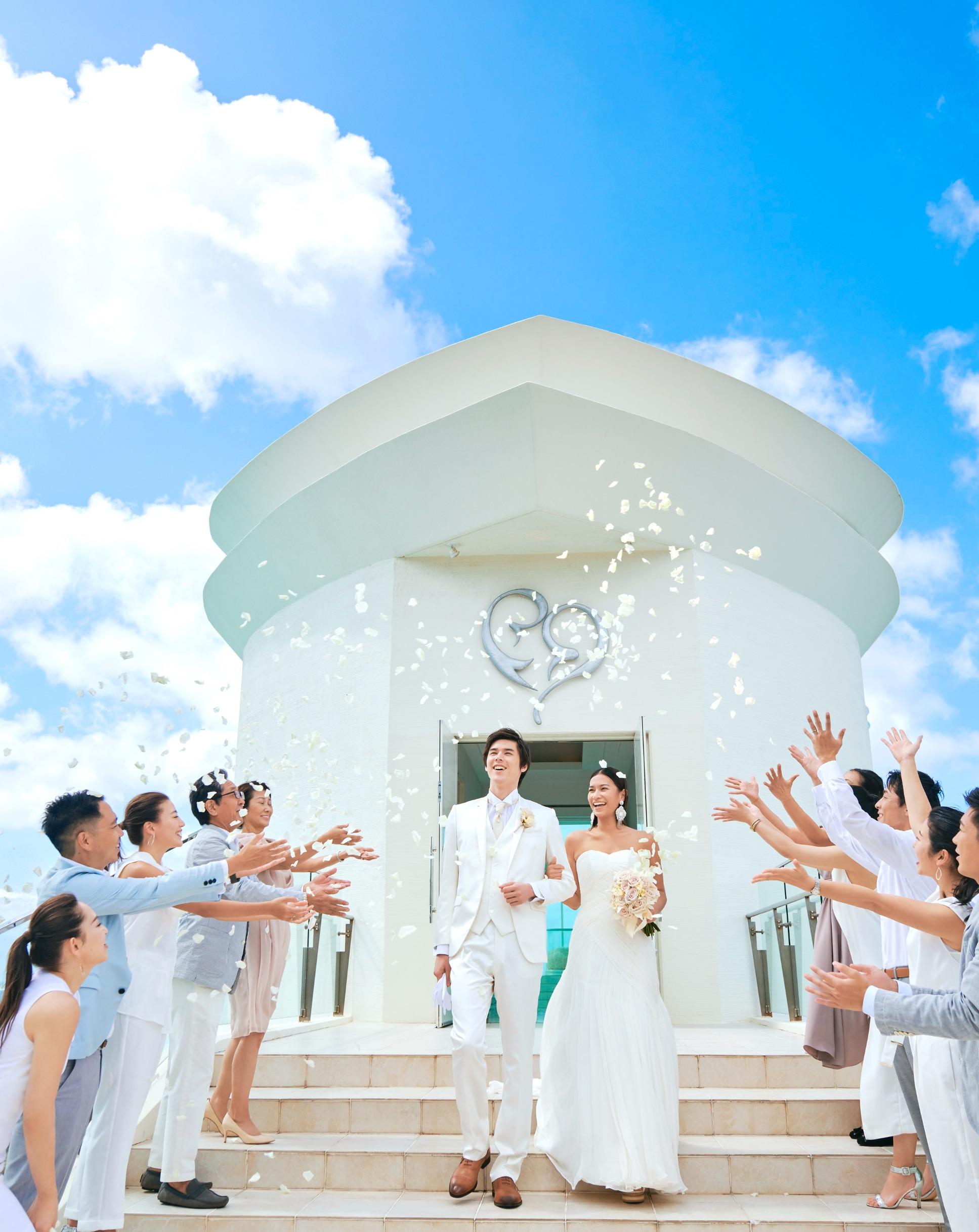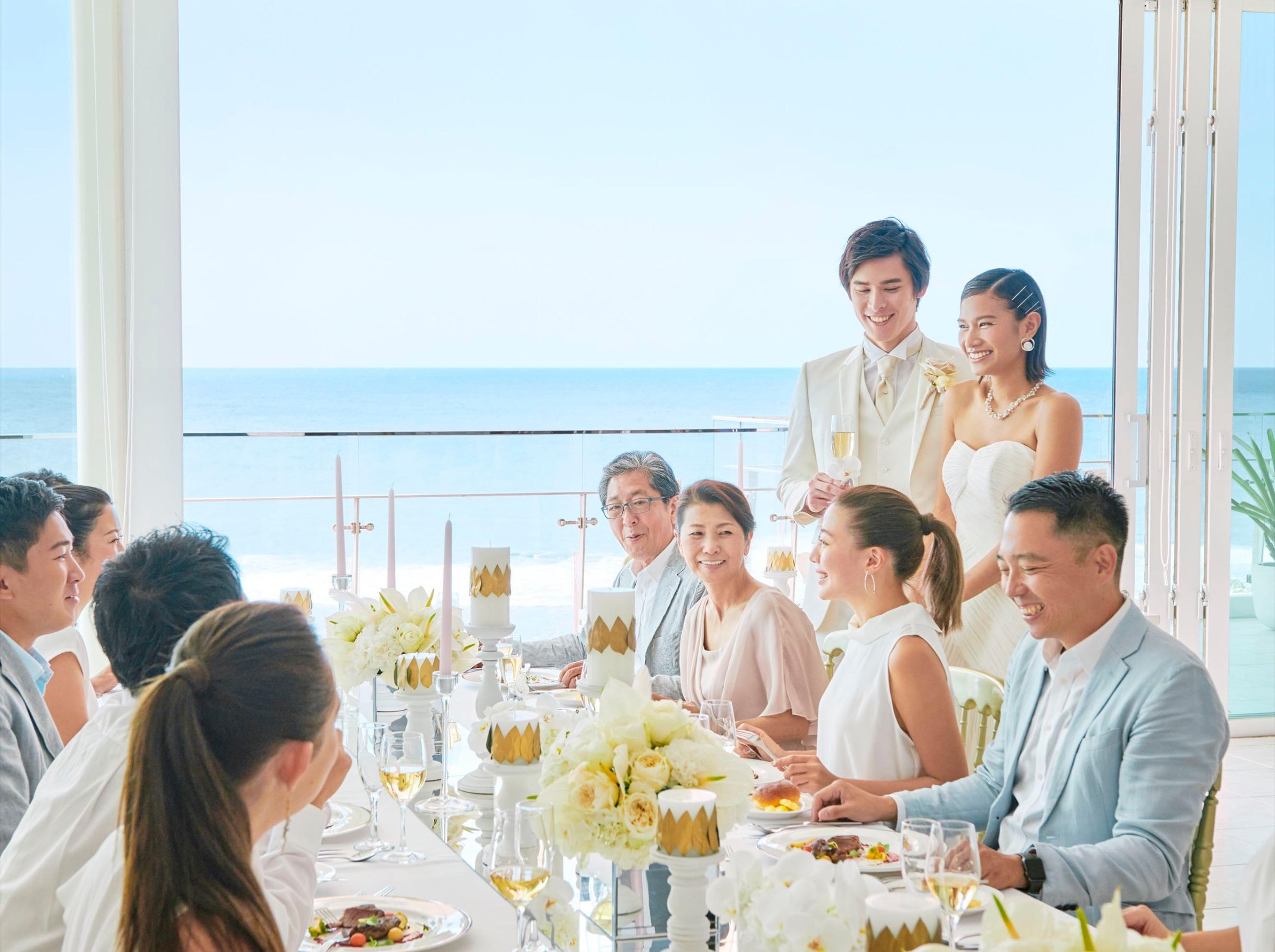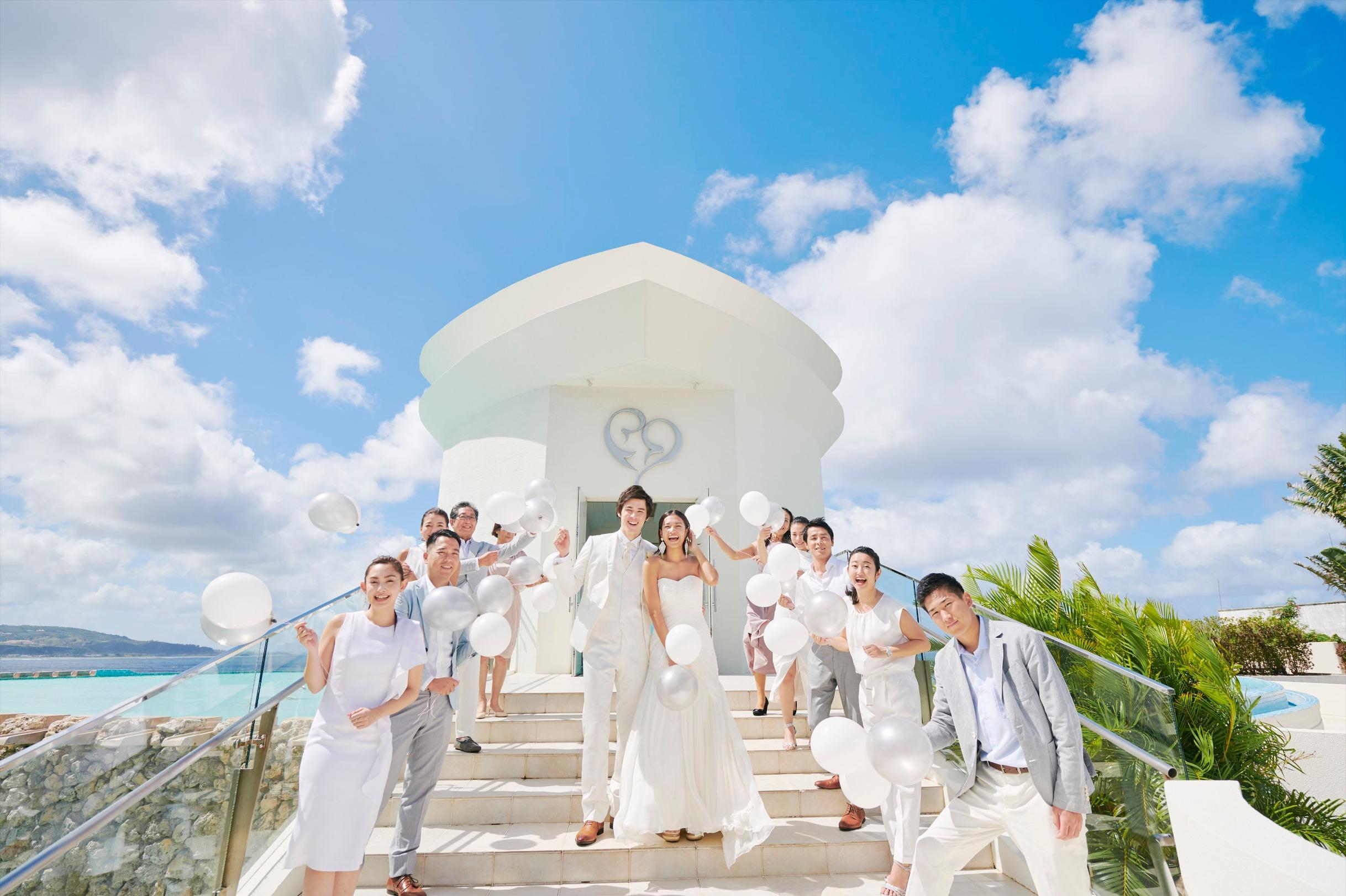 白と青のコントラストが描く光景に心を奪われる。青い海と空を感じながら祝福のときを迎えて。