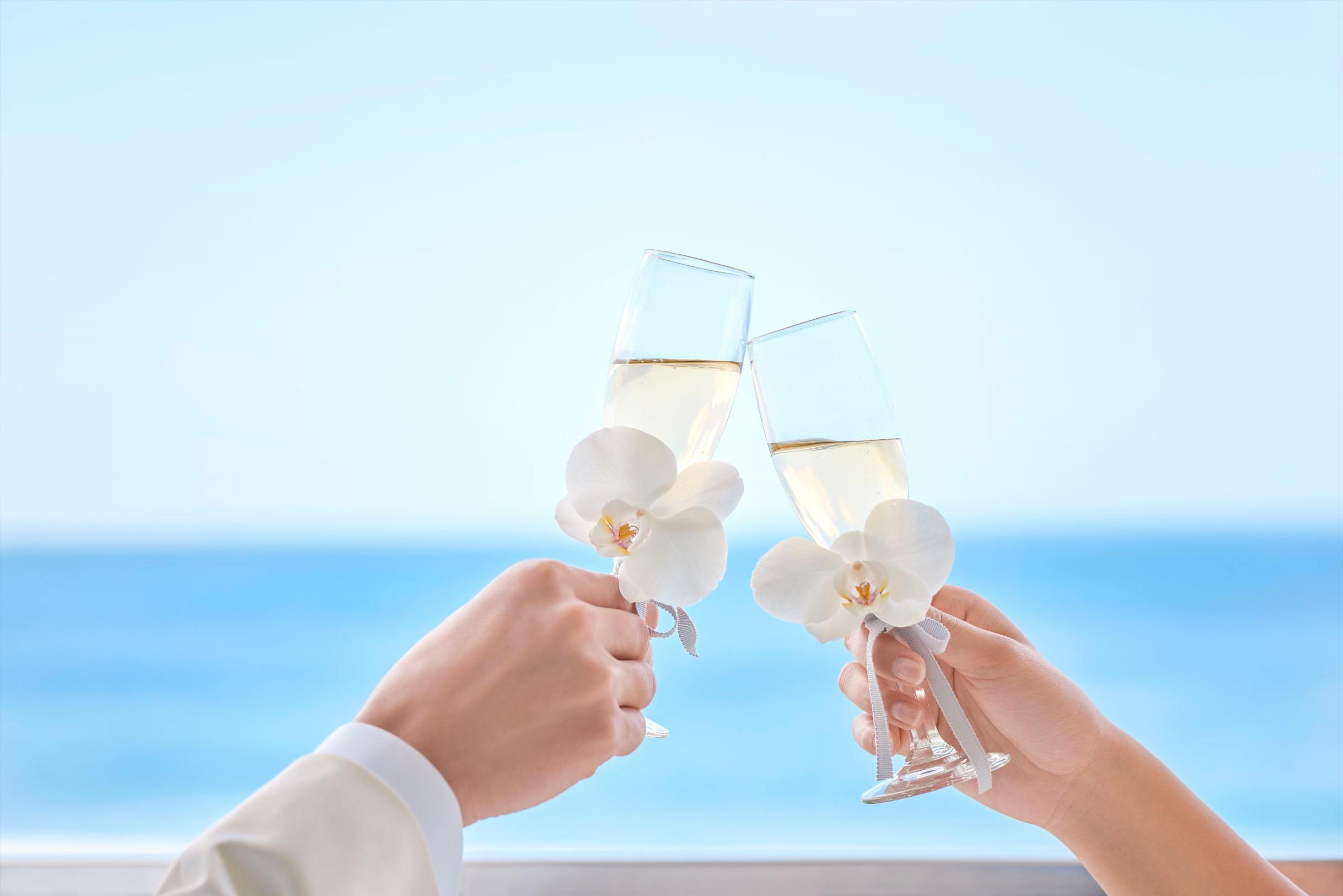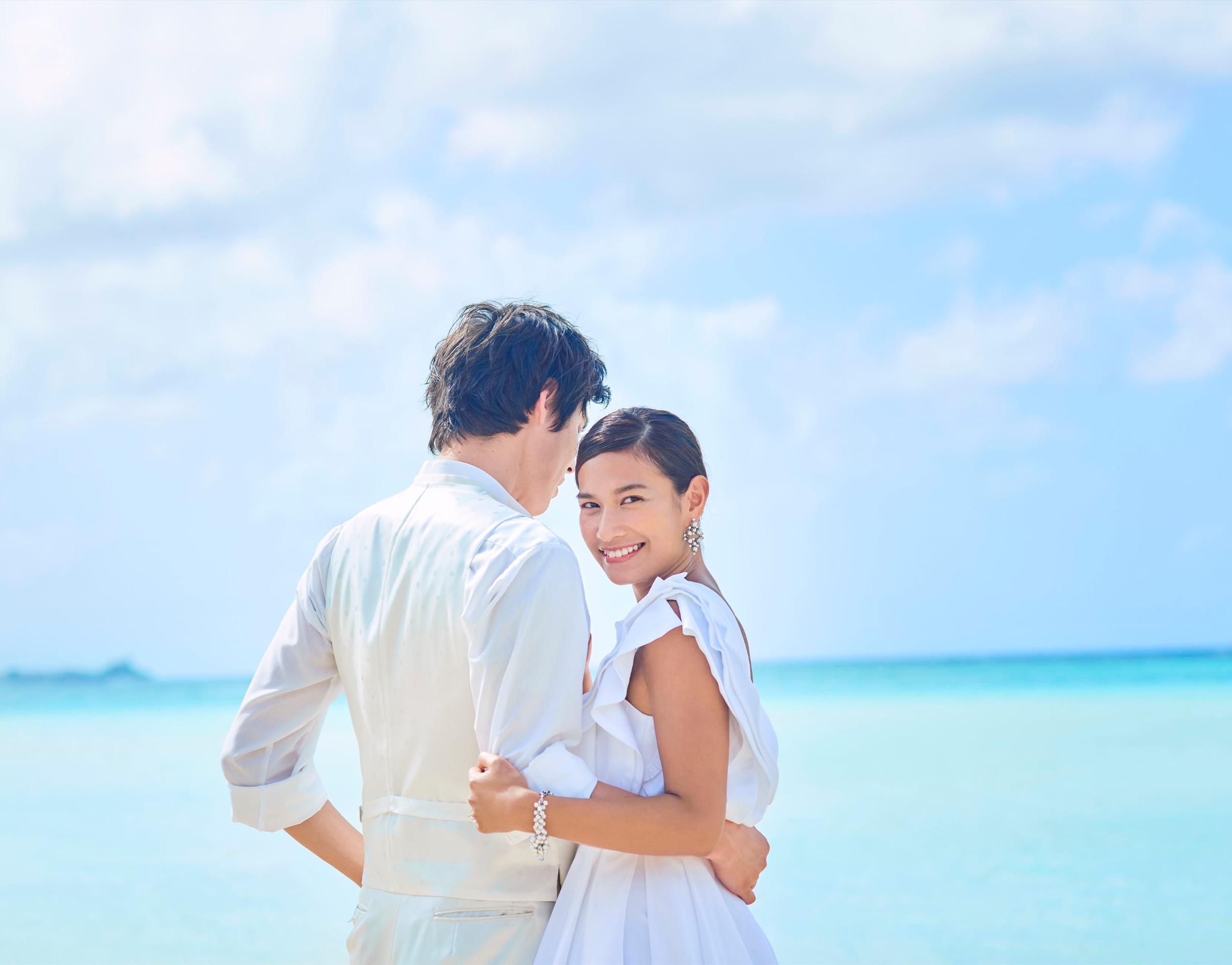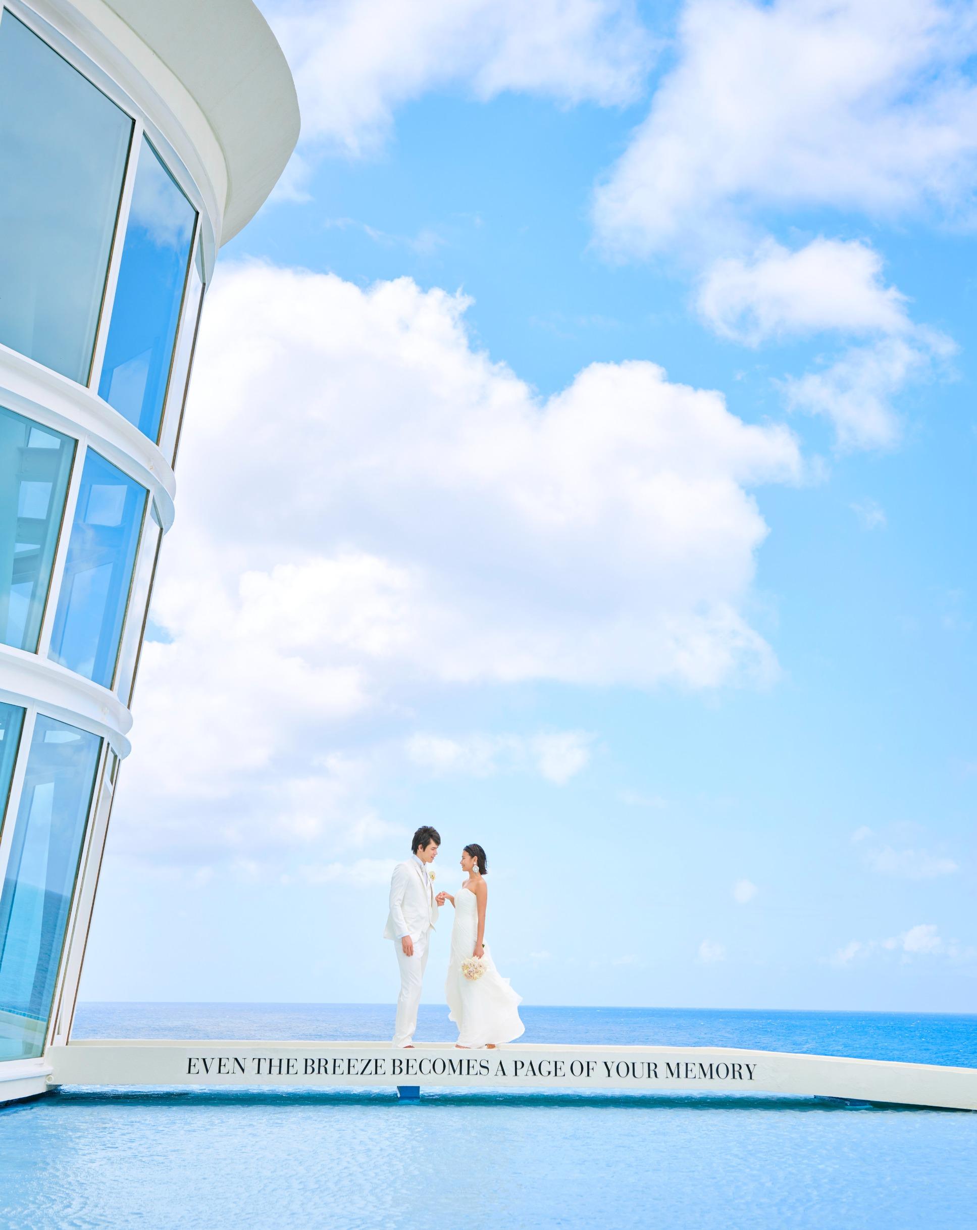 セレモニーの余韻をまといながら、海と空がひとつに溶け合う場所へ。ここでは開放感と心地よさに満たされ、いつもより素直なおふたりになれるはず。誓いを交わした嬉しさと幸福感、すべてをそのまま写真に残して。