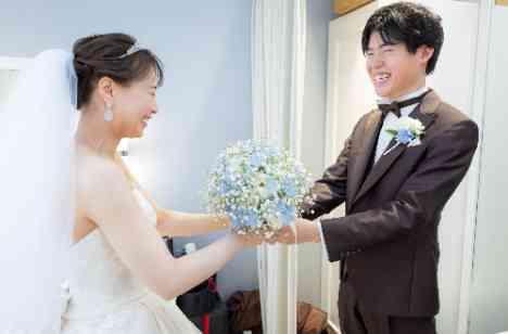 結婚式当日は楽しみなお気持ちと同じぐらい緊張も! お互い一生に一度の結婚式を楽しもうと、新郎様からお仕度を結んだ新婦様へ直接ブーケのお渡しを。 こちらのブーケも会場やドレスに合うように、カスミソウと水色の小花で作ったオーダーメイドブーケ!! お互いにお気に入りのドレスとタキシードを着て向き合っていただきましたが、素敵な姿に嬉し涙も…
