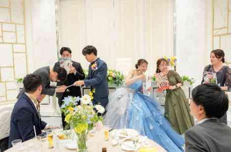 大人可愛く青色でまとめゲストと楽しむウエディング