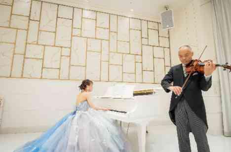 お二人が選ばれたアンジェブランシュの会場には、なんと白亜のグランドピアノ…! 新婦様は小さいころからピアノを習っており、お父様もバイオリンを弾くことができることから披露宴中に演奏を皆様へお届け。 お父様はもちろん家族みんなが楽しみにしていた演奏は素敵な音色で会場全体が幸せ空間に♡ 真っ白な会場、真っ白なグランドピアノのご用意なのでドレス姿がとっても目立ちます!