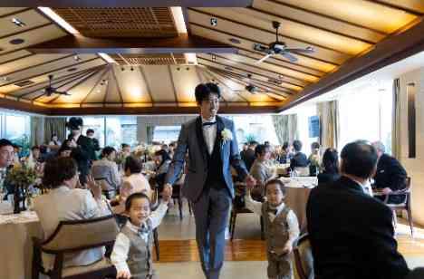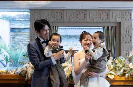 アルカンシエルはミキハウス認定式場ということもあり、お子様が登場するシーンも多く記念になること間違いなし。 ママの再入場を三人でお迎えに上がります。 会場が木目調で温かい雰囲気だからこそ、会場全体もアットホームな雰囲気に。 会話も自然と弾み、披露宴後半もゲストの盛り上がりは最大に。 この後の入場も大盛り上がりでした!