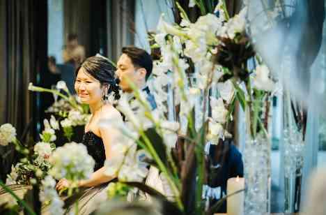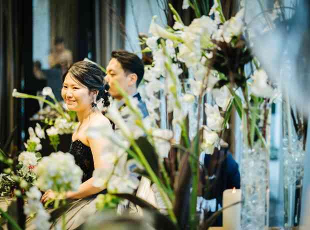 お二人は高砂をテーブルではなくソファスタイルへ変更。ソファスタイルにすることで、一生に一度のタキシード・ドレスをお召の姿を全身ゲストにもお見せ、写真に残すこともできます。また、360度どこから見ても装花が映り込み、ご自身の希望の雰囲気をより叶えることができます。白×黒のスタイリッシュな雰囲気に加え、所々にキャンドルを散りばめ一つ上の大人な洗礼された雰囲気へ。