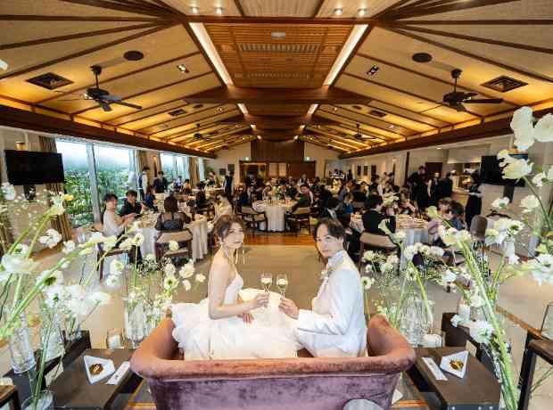 純白の装花をふんだんに使用すべく、お二人は高砂をテーブルスタイルではなくソファスタイルへ変更。ソファスタイルにすることで、360度どこから見ても理想の空間へ。撮影時には全身を映し出すことができ、ドレスアップされた姿をしっかり記録に残すことができます。またゲストと距離感もグンと近くなり、ゲストと自然体で関わることができます。