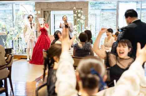 お二人はご披露宴の後半で似顔絵大会を実施。テーブルごとにお二人のお顔を真っ白の色紙へ記していただきました。一体感が出せる演出ですし、年齢問わずだれでも参加ができるのがGOOD!それぞれ個性が出る作品が完成し、完成後お二人はどのグループが仕上げた作品が一番ご自身に似ているか選びます。ご披露後ゆっくりとゲストは他のテーブルの作品を見たりと、セレモニー後も楽しんでいただけました。