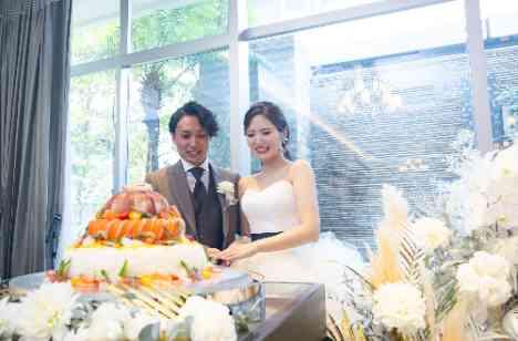 お二人はウェディングケーキの代わりに”お寿司ケーキ”をご用意。サーモンやマグロなど新鮮な食材を、大きなすし酢のタワーに乗せケーキ入刀。入刀後にはケーキ同様お互いに食べさせ合うファーストバイトを実施。ゲストはまさかのお寿司ケーキの登場にびっくりし、シャッターが鳴りやまず大盛り上がり。披露宴の結びにはお寿司をゲストへ振る舞い、ゲストは二度びっくりされお寿司ケーキセレモニーは大成功。