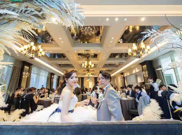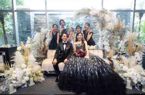 お二人が選ばれたのは、グランレーヴというモダンでスタイリッシュな会場。こちらの会場は三面ガラス張りになっており、高砂をソファスタイルにした際に抜け感を感じていただける会場です。スタイリッシュな空間に合わせ、お好きなブラックをカラードレスへチョイス。会場の雰囲気と相まって上質な大人ウェディングナ雰囲気に。
