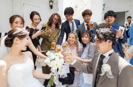 挙式は緊張と感動に包まれ、神秘的な雰囲気に…。ただ披露宴は、ゲストへ思う存分楽しんでいただけるよう当館オリジナルのウェルカムパーティを開催。ビール片手にお話をしたり、タキシード・ドレス姿で全身の撮影を楽しむことができるため、ゲストも一緒になって楽しめ、気分は徐々に披露宴モードへ。参列経験が多いゲストにも珍しい!と喜んでいただける特別空間へ。