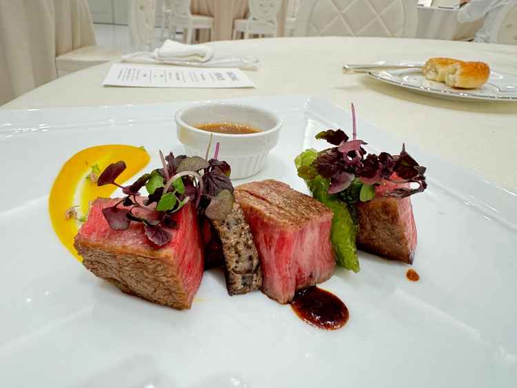 これまで試食会に参加した中で1番のおいしさ&プレゼンテーションでした!試食にも関わらず、前菜・スープ・パン・メインまで出してくださり、メインは洋風・和風でソースを選ばせていただけました。会場も実際の披露宴会場でプロジェクションマッピングやオープンキッチンの演出もあり、ゲスト目線で体感できたのが楽しかったですし、ゲストの方にも喜んでいただけるイメージが湧きました。