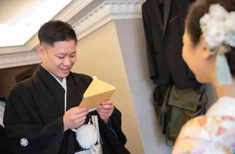 新郎様へ何かしてあげたい!そんな素敵な思いを抱いてくださった新婦様! 今回衣装の色打掛、WDをまずはサプライズにしてブライズルームでサプライズ披露を実行! さらに結婚式直前に新婦様のご懐妊が発覚! 合わせて新郎様には当日お伝えすることに! 写真はその時に手紙に託してご報告のシーン! 新郎様はとっても驚き嬉しさでいっぱいになった瞬間でした。