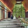 ◆天井高8mから降りそそぐ神聖な光に包まれる、緑と木の新チャペル。職人が丁寧に造り上げた、暖かみのあるアンティークガラスも魅力! -
