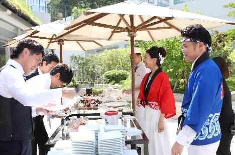 みんながワクワクするようなイベントになるよう、縁日の屋台をイメージして新郎様が実際にお寿司を握ってゲストに提供する演出をご提案!ゲストにおみくじを引いてもらい、大吉で中トロのように運勢によって握ってもらえるネタが変わるようにしました。またゲストへのサプライズ感を増すためにカーテンを閉めてガーデンにお寿司カウンターを設置。「寿司食いねえ」の音楽と共にカーテンオープンをしました。
