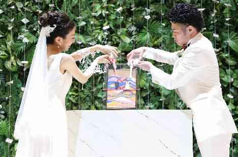 人前式の誓いの言葉は、おふたりと仲良しなご友人夫婦3組6名様から誓いを問いかけて頂く形にしました。先輩夫婦の皆様に夫婦として大切なことを考えていただき、それぞれ女性陣から新郎様へ、男性陣から新婦様へ1人1つずつ問いかけてもらいました。またゲスト1人1人がいてこそ今の自分達がいるという想いのおふたりなので、ゲストみんなで作る物があった方が良いと思い、サンドセレモニーを行いました。