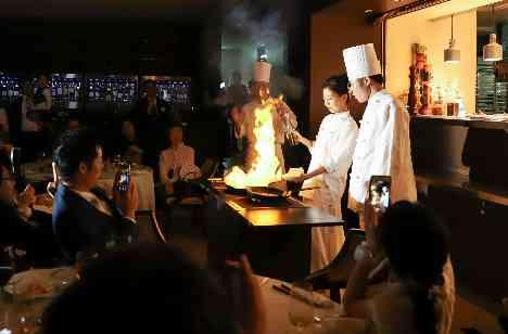 会場に隣接するガーデンにビニールプールを設置。氷を入れてキンキンに冷やしたオシャレなストレートボトルを使用し、夏の青空のもと盛大に披露宴がスタートしました!披露宴の中ではおふたりがコックコートを着て登場、新婦様がフランベを行う演出も取り入れました!また新郎様からのサプライズで新婦様へピアノの生演奏。曲名の「花束」に合わせて「あなただけを見つめる」という花言葉のあるひまわりの花束を贈りました!