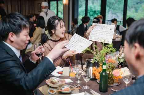おふたりが大好きなお笑いにちなんでご用意されたオリジナルゲームはグループごとの対抗戦 新婦様がお色直し中に各グループごとにふたりのことを考えて終始賑やかな会場では 新郎様は自由にご挨拶周りをしながら過ごされておりました おふたりを介してこうやって奈良 菊水楼に集まったゲストの絆がさらに深まる時間となりました