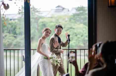 おふたりが選ばれたのはまだまだ緑豊かな初秋の頃。会場から見える四季折々の景色をみんなにも楽しんで欲しい。そんなおふたりが選ばれたお色直しのご入場は緑溢れるテラスから。会場の扉に目線を向けていたゲストの皆様はおふたりの思惑通りに騙され、そんな驚きの表情に満足するような笑顔で手を振りながらみなさまの元へ。