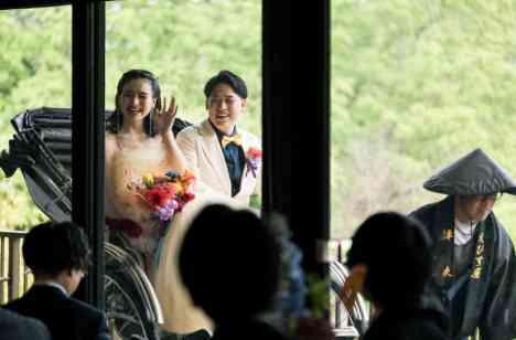 お気に入りのドレスでの再入場は、奈良の景色になじむ人力車で会場も大盛り上がり。たくさんのゲスト一人ひとりにご挨拶をするため会場を自由に走り回る新婦様、ゲストとともに名残惜しい時間を過ごされました。披露宴の結びはおふたりのご発声で行うワンモアチアーズを。チアーズには、『ありがとう』や『またね』という意味も込めておふたりとゲストが今後も素敵なご縁でつながっていられますように。