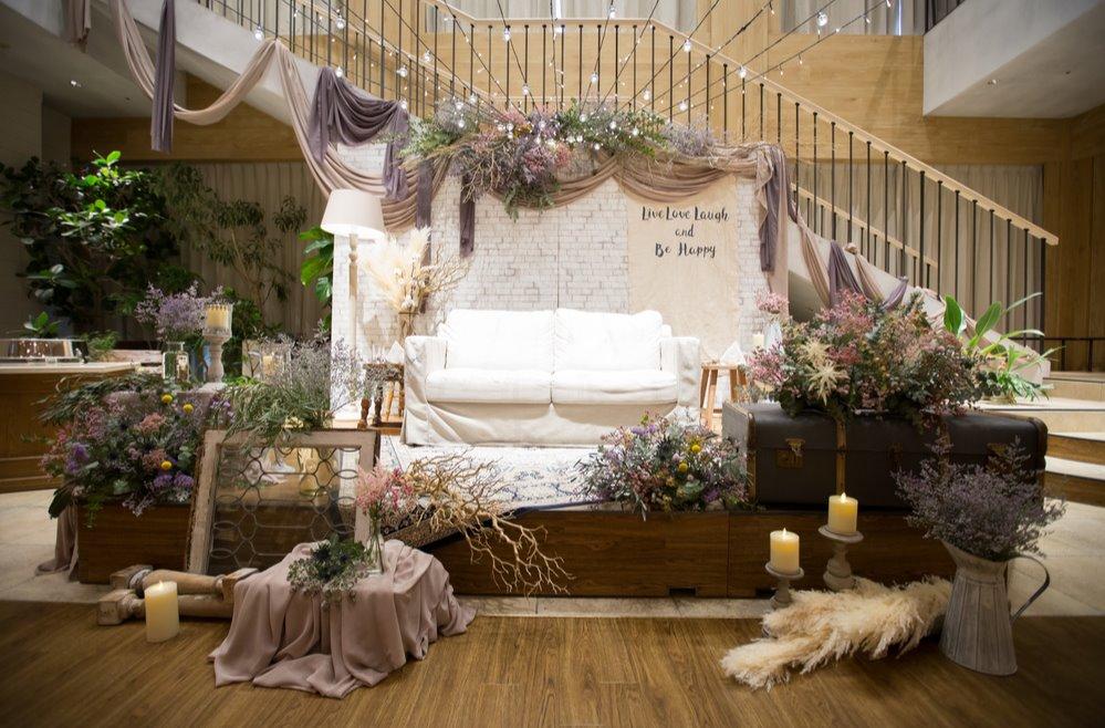 絆をより感じたい、みんなに温かい・心地よい空間を感じてもらいたいご意向があったのでお二人のメイン席もリビングをイメージしました ランタンの灯りで会場内も照らし、心地の良い空間とどことなくほっとする雰囲気を演出しました