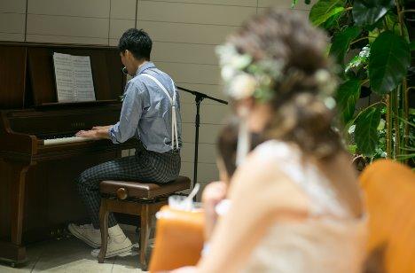 新郎様から日ごろの感謝やこれからもずっと家族仲良くやっていこうという気持ちを伝えたいとご希望を頂きサプライズを行いました。歌が上手な新郎様だったので、ピアノの弾き語りを行って想いを伝えたもらいました。もちろんピアノ演奏は初めてだったので、お仕事終わりに、職場にあるピアノで練習を重ねてこられました。本番では詰まってしまうシーンもありましたが新婦様には想いがしっかり伝わり涙を流されるシーンとなりました