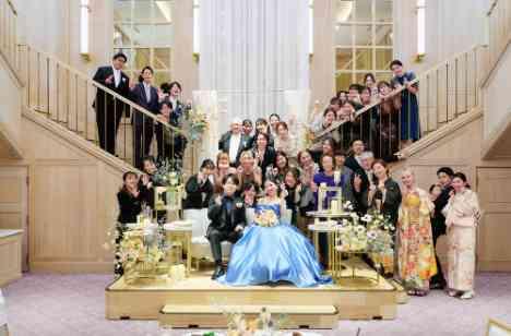 披露宴の中盤に、ゲスト全員で集合写真を撮影!披露宴時間が2時間半あるからこそ、進行の組み立て次第でこうした素敵な一枚を残すことができます。お食事やお酒が進み、自然とリラックスした表情があふれるタイミング。会場全体が一体となり、笑顔がいっそう輝く温かな時間になりました。さらに、後から見返しても当日の空気感がそのまま蘇ります。