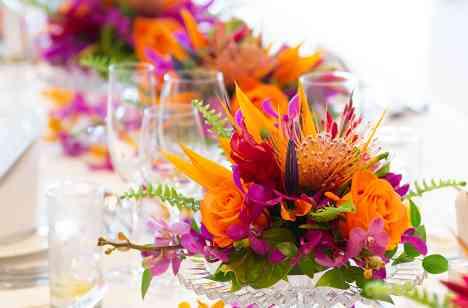 ご家族だけのアットホームなご結婚式。皆様にもリゾート感を味わってもらいたいとアイテム選びもこだわりました。 テーブルフラワーはリゾートらしいハッキリとしたお色味のオリジナルデザイン!会場の雰囲気がパッと明るくなり、華やかなパーティを演出☆ 他にもハイビスカスを使ったスパークリングワインなど一つ一つリゾートを感じていただけるアイテムにご家族からも大好評でした!