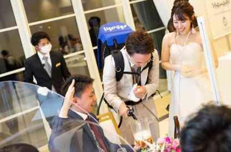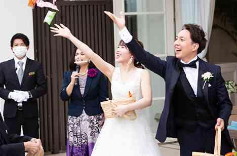 「出来る限り沢山の方にゆっくりと日ごろの感謝の気持ちを伝えたい」 そんなお二人のご要望から親族様だけのパーティ・友人様を分けた二部制パーティーをご提案させていただきました。 また、ご新婦様が沖縄出身ということで沖縄のゲストも多数いらっしゃるというこで、新郎様のご出身である愛知県の伝統的な演出「お菓子巻き」を進行に加え、大人からお子様までお二人が投げたお菓子をキャッチして楽しんでくださいました。