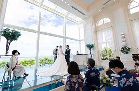 おふたりが選ばれたご結婚式のスタイルは教会式。海が一望できる光溢れるチャペルでお母様にベールダウンをして頂いた後、今までの想い出を胸に、青いバージンロードをお父様とゆっくりとお進み頂きました。お式後、緊張が解けたおふたりは、大歓談を笑顔でご登場。皆様と一緒にバルーンリリースを楽しまれました。「ふたりの幸せが天まで届きますように」