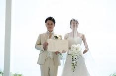 おふたりのテーマにあわせて、挙式スタイルは『人前式』 大切なゲストの皆様に向けて一生の愛を誓っていただく挙式スタイルです。 おふたりの結婚証明書には参列していただいた全員の署名を。 大切な皆様に見守られて、素敵な挙式となりました。