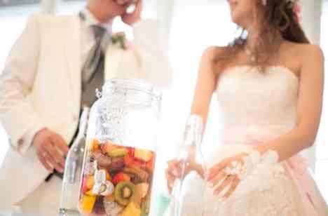 「リゾート婚らしい演出がしたい」おふたりはパーティの演出に“フルーツサングリア”を作ることにされました☆ゲストとの会話を楽しみながら、ゲストに色とりどりのフルーツをメイソンジャーに入れて頂きます♪そして、仕上げはおふたり☆沖縄らしい甘いハイビスカスティ―を注ぎ、世界に一つだけのスペシャルドリンクの完成です☆初めての演出に、ゲストからも歓声がわきました