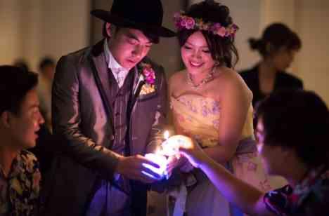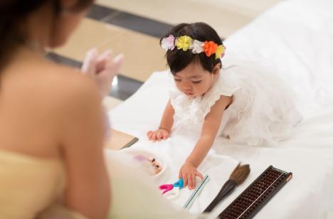 沖縄では1歳のお祝いに健康を祈願する“たんかゆーえー”という行事がございます。おふたりはそのセレモニーを披露宴にて行いました!ご飯や筆、本やお金などが並ぶ中、お子様がどのアイテムを取るかで将来どんな子になるか占います☆ ちなみにおふたりのお子様は、はさみを選びました!将来きっと手先が器用になるはずです♪