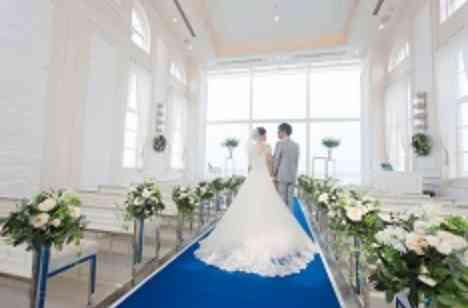 相談会のご参加の時からお気に召していただいていた【青のバージンロード】 挙式当日、チャペルからまっすぐ海へと伸びるバージンロードの存在感と、その上を歩くご新婦様のドレスのコントラストが本当に素敵でした。