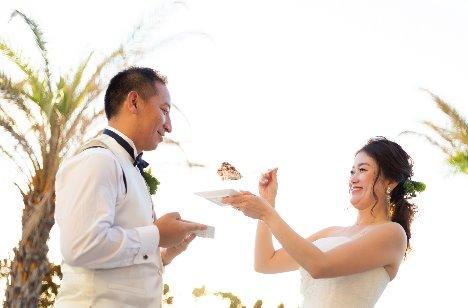アットホームな雰囲気で、テラスを使用したいとご希望のお二人。 パーティー会場目の前のテラスで、サンセットをお楽しみいただきながらケーキ入刀のセレモニー。 ゲストの皆様とテラスでのお写真撮影も行いながら、のんびりアットホームなウエディングパーティーとなりました。