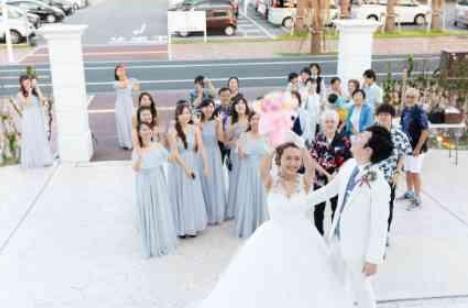 大階段でのブーケトスは女性だけでなく、ゲスト全員参加に!晴天の下、綺麗なブライズメイド達が待ち構えていらっしゃいます。 勢いよく聖蘭さんから放たれたブーケ。おふたりからの幸せのおすそわけは誰の手に…?