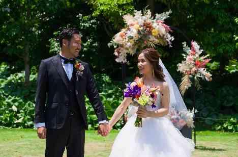 「披露宴のための助走」と位置付けた人前式。リラックスした雰囲気で参加してもらうために、新郎新婦入場前にヨガを取り入れたり、楽しい気分になってもらうために、楽曲はゲストにも馴染みのある曲で統一したり、この後の披露宴をより楽しんでもらうことを意識してプランニングしました。 天気だけが心配でしたが、100点満点の快晴で、清々しいガーデンウエディングになりました。晴れてくれてほんとに良かった・・・!