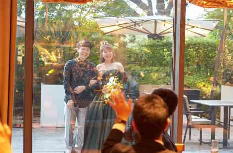 おふたりのお色直し後は、入場口からではなく、 なんとバルコニーからのサプライズ入場! ゲストの皆様も「わー!」と盛り上がり、会場の雰囲気も最高潮に盛り上がりました。 おふたりこだわりの衣装を身に纏って再びゲストとのお時間がスタート。 ゲームや歓談、おふたりが叶えたかったことを詰め込み、あっという間に結びとなりました。