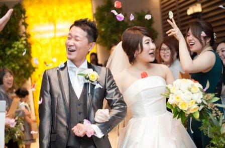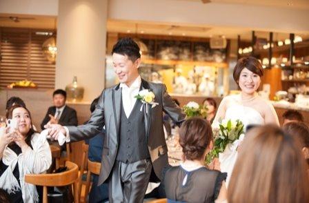最初のムービーは、誰もがご存知のコント番組のパロディにしたんです。前半ははほぼ歓談タイムにしました。高砂を設けずみなさんと同じ目線で過ごせたので、私たちのところに次々とゲストが来てくれて、自由な時間を楽しめました。笑いばかりでは全体が締まらないと思い、感動的なシーンも用意しました。再入場では、私の大好きなアーティストのバラード曲を流しました。事前に細かく相談したのでタイミングが完璧でした。