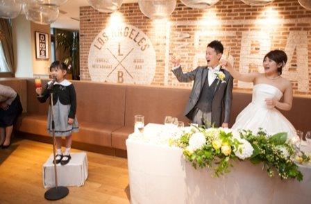 乾杯の音頭は、主人の姪っ子にお願いしました。仕事関係のゲストも招待していたのですが、どちらにもとくに上司に当たる人がいなかったのでできた演出ですね。小さな子供が「諸先輩方の前で僭越ではありますが」などと話すのもかわいらしく、爆笑が巻き起こりました。
