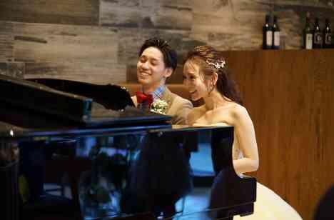 ふたりとも「旅」が好きなことから、ウェディングケーキはオリジナルで作成! 世界地図がプリントされた世界に一つ多田家のオリジナルケーキに、旅行で訪れたことのある国には赤いポイントをつけておふたりの世界旅行の足跡もプラスしました! この瞬間は、会場も大盛り上がり! そして、新婦が幼いころから習ってきたピアノを使った演出も!