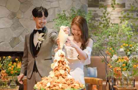 好きなものを好きなままに!をご披露宴のテーマとしていたので、ケーキ演出もおふたりの大好物で行っていただきました。 それが唐揚げタワー! 入刀の代わりにおふたりにはマヨネーズをかけていただき完成。 迫力満点の唐揚げタワーの登場にゲストの皆様もびっくり! とっても盛り上がり、大成功でございました。 そして、幸せのおすそ分けとして、ゲストの皆様にもこの唐揚げを召し上がっていただきました。