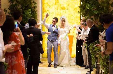 木の温かみとオニキスの輝き、爽やかなグリーンが印象的な、館内チャペルでした。はじめにフラワーシャワーのフライングがあって突っ込みが入ったり、立会人をお願いした上司とのやり取りが小芝居じみていたりと、参列席からたくさんの笑い声が沸き起こるセレモニーになりました。誓いの後は晴れてフラワーシャワーを浴び、笑顔で退場!ゲストにも大勢参加してもらいアットホームな式でした!