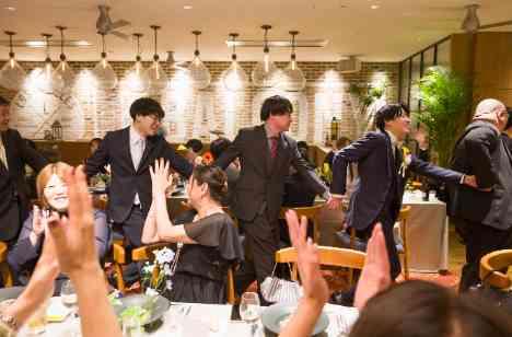 これまでの人生を共に楽しんできたご友人様との 日常を結婚式で! パーティーの序盤では ご新郎様も一緒になって吹奏楽時代のご友人様と 「きみといつまでも」を演奏いただき 会場は大盛り上がり! ご披露宴後半では共にバンドをされていたご友人様とも 演奏をして頂きご新郎様のバンド人生を全員で お楽しみ頂くお時間となりました。 ご新郎様の中座は吹奏楽部のご友人様と全員で行いました!