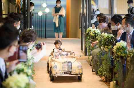 THE TENDER HOUSEのチャペルは自然光が柔らかく入り込み、石・水・緑をふんだんに使ったナチュラルで温もりを感じるテイスト。 温かな雰囲気でお式が進んでいく中、リングボーイとして車に乗ったおふたりのお子様の登場! ゲストの皆様もより一層笑顔が溢れ、和やかな空気がチャペル内を包み込みます。