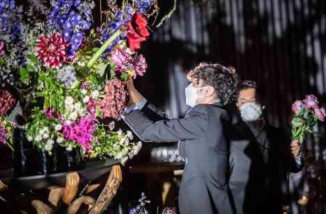 お二人がお色直しで席を外している間、会場に登場したのはフラワーデコレーター。 音楽に合わせながら、グリーンベースの会場装花に赤・紫など鮮やかなフラワーを追加していきます。 グリーンのナチュラルな装花が、一気に華やかな雰囲気に変わりました。 パーティーのテーマやカラードレスの色に合わせて、装花の雰囲気を変えることができます。 お二人が席を外している間でもゲストの方が退屈せずに過ごせますね。