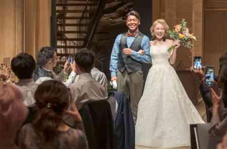 結婚式らしい挙式やケーキカットを結び、新婦の衣裳・ヘアチェンジ、新郎の小物チェンジで私たちらしさ全開の再入場は、ゲストの笑顔で会場の雰囲気も変わるような、印象深いシーンでした がらっとイメージを変えられるように、新郎はデニムシャツにオレンジの蝶ネクタイ、新婦はウェーブをつけてヘアチェンジし、存在感あるアクセサリーを取り入れました