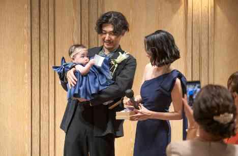 ご新郎様の職業が美容師さんとのことで、ご新婦様の綺麗な黒髪をばっさりとヘアカット。ボブヘアでワンショルダーのスレンダーマーメイドのネイビードレスで再入場。ご新婦様のお姿に会場中のゲストも大きな拍手と歓声が。お子様もご一緒のカラーでお色直しを行い、ゲスト卓をまわってお披露目ラウンドを行われました。笑顔の絶えないご結婚式となりました。