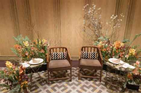 ご新婦様が特にこだわったメインチェア装花は、秋らしいオータムカラーをベースにアシンメトリーなデザインと地面から立ち上がるように装飾された大胆に枝を使用したアレンジメント。キャンドルカップもついており、照明暗転時にはキャンドルの灯がゆらゆらと動く仕掛けに。高砂テーブルは外し、チェアにすることでよりゲストと近い距離で会話も楽しめる。