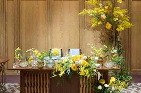 会場装花は鮮やかなイエローが特徴的な装花を多数使用。 こちらのイエローのお花の花言葉は”一緒に踊って”のオンシジウムという花材。多数使用数ことで華やかさと小花が彩ります。メインテーブル横には半アーチを入れておふたりのメイン装飾を華やかに演出。高砂テーブル上の装花はアシンメトリー菜デザインにしてトレンドをおさえた雰囲気に。