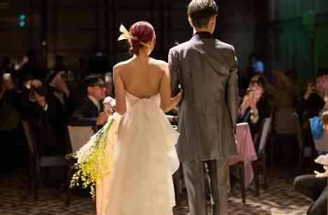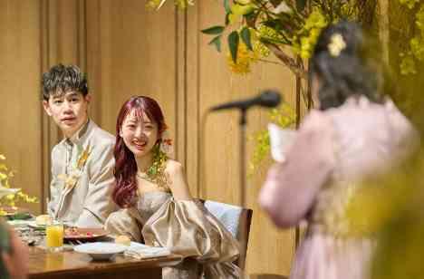 ウェディングドレスはスレンダーなシンプルなフロントにバックコンシャスな1着。シンプルながらもデザイン性が高い人気のドレスです。赤いヘアカラーに白のカラーを挿したスタイルがとてもお似合いです。お色直しはパフスリーブのベージュゴールドの華やかなデザインのカラードレス。会場装花のオンシジウムのイエローと相まってアットホームな雰囲気も創り出します。