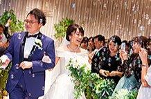 温もりのある木や輝く水辺など、ナチュラルな雰囲気が漂うチャペル。「当日はあいにくの雨でしたが、それを感じさせないほど明るく、空気も澄んでいました」。等身大のふたりらしい言葉で誓いを立てると、ゲストも笑顔で祝福。晴れやかな気持ちで退場する際は、七色に光るシャボン玉シャワーでフォトジェニックなシーンに。