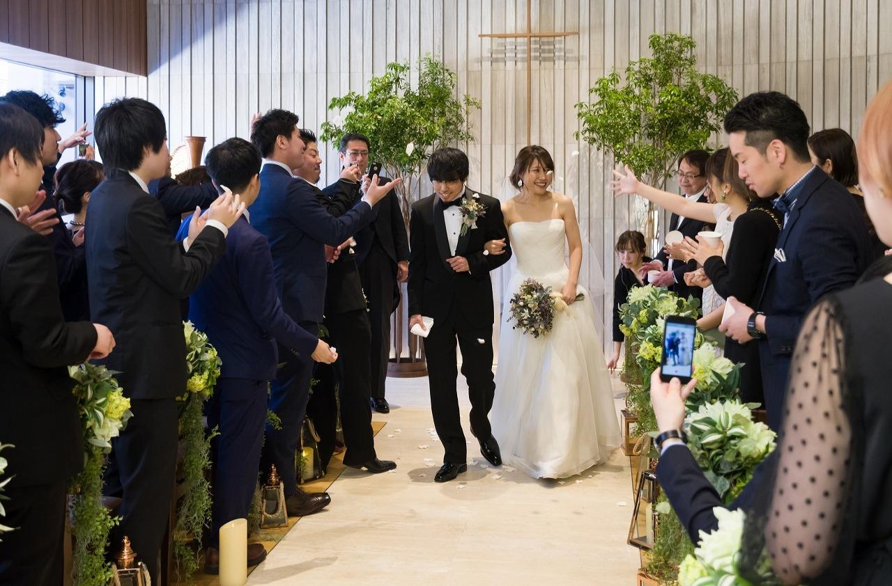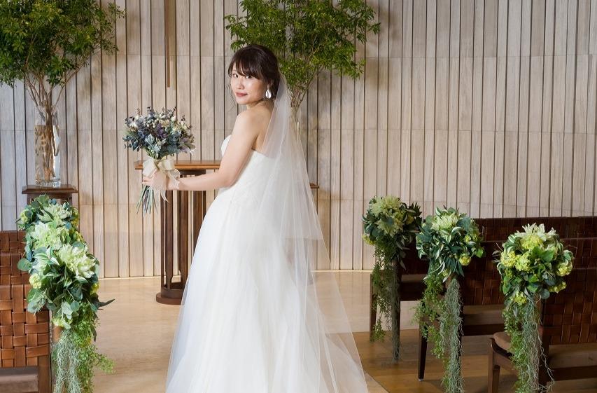 緑や木、石壁などの自然素材がナチュラルな雰囲気を醸し出すチャペル。お互いにオリジナルの約束を用意し、愛を誓った。「私たちは緊張でぎこちない場面もありましたが、リラックスムードのゲストが思いきり笑ってくれたので気持ちがほぐれました」。挙式後はチャペル内での集合写真や、ふたりのフォトタイムを満喫した。